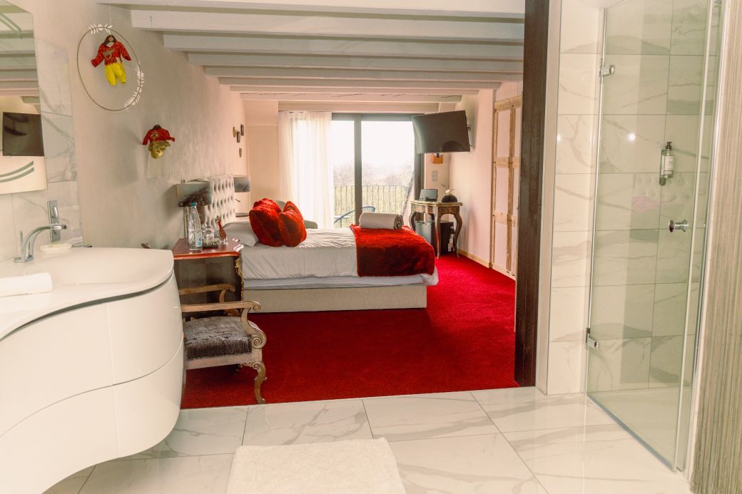 Chambre de charme avec terrasse privative, vue sur les vignes et la Forêt Noire. Surface environ 28 m2.